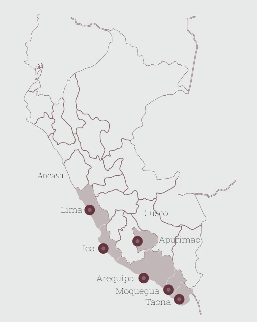 La franja costera del sur del Perú presenta las condiciones ideales para el desarrollo de la vitis vinifera. Los variados suelos, la escasez de lluvia y  las diferentes altitudes de los valles han permitido la rápida adaptación de las uvas patrimoniales, llamadas así a las uvas traídas por lo españoles y que desde entonces se han convertido en parte de nuestro patrimonio vitivinícola, las variedades criollas como la quebranta y las más conocidas variedades nobles, principalmente de origen francés.